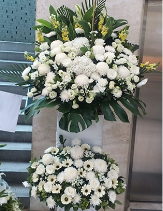 A gracefully arranged flower stand for the funeral service to pay reverence to the departed and the bereaved friends and family.
